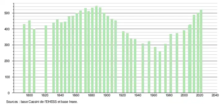 L'évolution du nombre d'habitants est connue à travers les recensements de la population effectués dans la commune depuis 1793. Pour les communes de moins de 10 000 habitants, une enquête de recensement portant sur toute la population est réalisée tous les cinq ans, les populations légales des années intermédiaires étant quant à elles estimées par interpolation ou extrapolation[65]. Pour la commune, le premier recensement exhaustif entrant dans le cadre du nouveau dispositif a été réalisé en 2007[66].