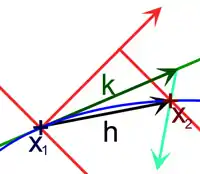 La lettre o désigne un petit o selon la notation de Landau et le point entre le gradient de φ et h symbolise le produit scalaire. Le vecteur gradient est orthogonal à la courbe de niveau, dans le sens des valeurs croissantes de φ et de norme proportionnelle à la vitesse d'accroissement de φ dans cette direction. La contrainte vérifie une propriété analogue puisqu'elle est aussi différentiable. L'ensemble étudié est celui des valeurs x telles que ψ(x) est nul. Si x0 est élément de G, les points voisins de x0 dans G ont aussi une image nulle par ψ, autrement dit, l'espace tangent à G au point x0 est formé par les accroissements h de x0 qui ont une image nulle par la différentielle de ψ. La direction de l'espace tangent est le noyau de l'application différentielle de ψ. Une analyse par les fonctions coordonnées ψi exprime ce résultat en indiquant que l'espace tangent est l'intersection des hyperplans orthogonaux des gradients des ψi.
