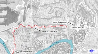 Presque sur la berge du fleuve au sud-ouest, au niveau où est construit en 1918 le nouveau pont Sublicio, la muraille s'ouvre par la Porta Portese qui remplace la Porta Portuensis du mur d'Aurélien[8] ; elle commence tout de suite après à gravir les pentes du Janicule en direction de l'ouest et coupe le tracé du mur d'Aurélien.