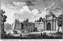 La Porta San Pancrazio, au sommet du Janicule, est construite en 1644[14] tout contre la face externe de l'ancienne Porta Aurelia du mur d'Aurélien qui subsiste encore pendant un temps[5]. Elle est détruite en 1849 et reconstruite cinq ans plus tard au même emplacement mais sur un plan beaucoup plus monumental. Elle doit son nom à la basilique San Pancrazio dont elle est proche[13]. Géolocalisation : 41,8803, 12,3912.