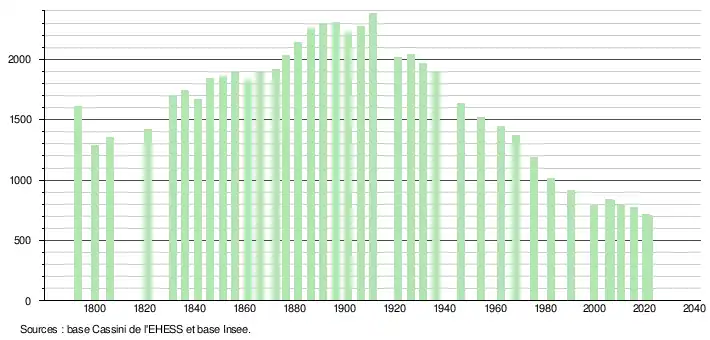 L'évolution du nombre d'habitants est connue à travers les recensements de la population effectués dans la commune depuis 1793. Pour les communes de moins de 10 000 habitants, une enquête de recensement portant sur toute la population est réalisée tous les cinq ans, les populations légales des années intermédiaires étant quant à elles estimées par interpolation ou extrapolation[32]. Pour la commune, le premier recensement exhaustif entrant dans le cadre du nouveau dispositif a été réalisé en 2005[33].