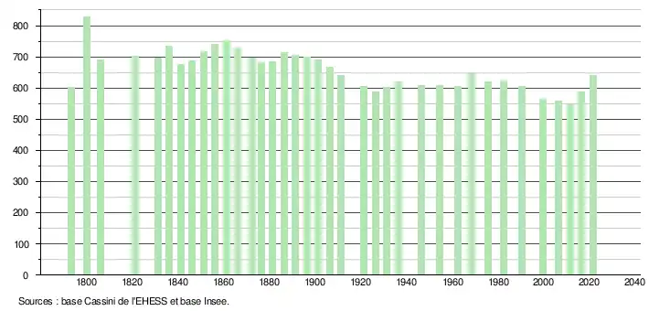 L'évolution du nombre d'habitants est connue à travers les recensements de la population effectués dans la commune depuis 1793. Pour les communes de moins de 10 000 habitants, une enquête de recensement portant sur toute la population est réalisée tous les cinq ans, les populations légales des années intermédiaires étant quant à elles estimées par interpolation ou extrapolation[32]. Pour la commune, le premier recensement exhaustif entrant dans le cadre du nouveau dispositif a été réalisé en 2006[33].