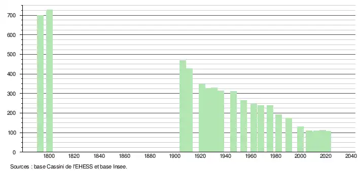 L'évolution du nombre d'habitants est connue à travers les recensements de la population effectués dans la commune depuis 1793. Pour les communes de moins de 10 000 habitants, une enquête de recensement portant sur toute la population est réalisée tous les cinq ans, les populations légales des années intermédiaires étant quant à elles estimées par interpolation ou extrapolation[42]. Pour la commune, le premier recensement exhaustif entrant dans le cadre du nouveau dispositif a été réalisé en 2007[43].