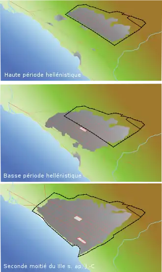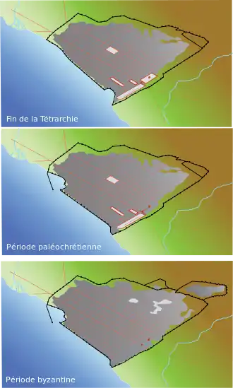 Agrandissement du mur de Thessalonique depuis l'antiquité sur la gauche la période romaine puis Byzantine sur la droite. | ||