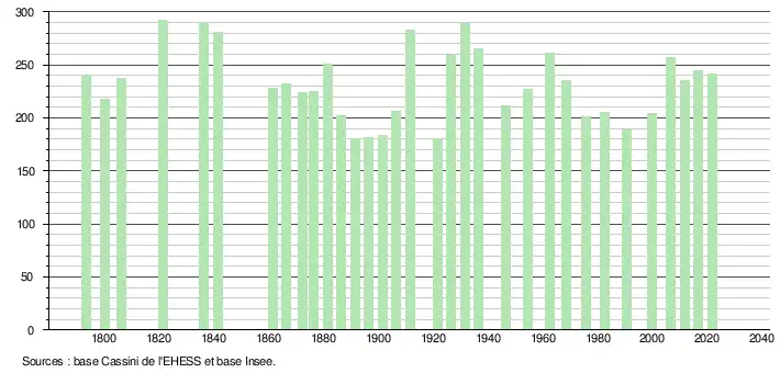 L'évolution du nombre d'habitants est connue à travers les recensements de la population effectués dans la commune depuis 1793. Pour les communes de moins de 10 000 habitants, une enquête de recensement portant sur toute la population est réalisée tous les cinq ans, les populations légales des années intermédiaires étant quant à elles estimées par interpolation ou extrapolation[17]. Pour la commune, le premier recensement exhaustif entrant dans le cadre du nouveau dispositif a été réalisé en 2006[18].