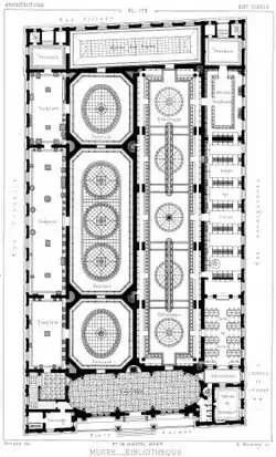 Au niveau principal, se trouvent de gauche à droite quatre groupes de salles dont la destination d'origine est gravée au-dessus de chaque porte d'accès. L'ancienne salle des sculptures et gravures, les trois grandes salles de l'ancien musée hautes de 10 mètres environ, puis la grande salle de l'ancienne bibliothèque, haute de 12 mètres avec ses galeries et son jeu de colonnes double, ses cinq coupoles et ses peintures monumentales, et enfin le groupe des anciennes salles de lecture et du dépôt des livres de la bibliothèque.