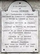 « À la mémoire de Lucien Térion, dit : Tourangeau l'Intrépide, président des Compagnons charpentiers du Devoir de liberté de Paris, meilleur ouvrier de France, lauréat du travail de Belgique, lauréat de la Ligue d'enseignement et d'éducation sociale, lauréat de la Société arts, sciences et lettres, déporté politique mort pour la France au camp de Mauthausen le 3 mai 1945[3]. »