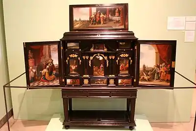 - Cabinet à peintures décorés de douze médaillons peints par Frans II Francken représentant différentes étapes de la vie du prophète Daniel relatées dans le livre de Daniel de la Bible. Ce genre de cabinet à trésors qui étaient destinés aux collectionneurs anversois, renfermaient dans leurs nombreux tiroirs des objets variés : dessins, médailles, minéraux, coquillages etc. Le cabinet présenté est postérieur à 1620, phase de maturité de l'artiste qui produit à cette époque ses œuvres les plus abouties ; c'est l'un des deux seuls exemplaires connus peints par Frans Francken le jeune, véritable chef-d'œuvre, unique en France[12], en provenance de la collection Puech.