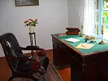 Dès 1912, la cousine germaine de Mikhaïll Lermontov, Ievguenia Chan-Guiraï[alpha 8], donne le bureau et fauteuil du poète depuis Saint-Pétersbourg[3], bureau où de nombreuses de ses œuvres au poète furent écrites[5]. Elle déclara d'ailleurs, à Saint-Pétersbourg, juste avant le départ pour Piatigorsk, que « Avec ce tableau, comme disait mon père, il avait beaucoup de souvenirs du poète. Derrière lui, il lisait ses ouvrages à son père. A la veille du dernier départ de Lermontov de Pétersbourg, ils ont trié les papiers ensemble, les vieux manuscrits du poète rangés dans les tiroirs de son bureau, sélectionnant les poèmes nécessaires pour un nouveau recueil, les manuscrits inutiles ont été brûlés dans la cheminée »[alpha 17].