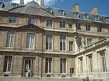 Le porche ouvre sur une cour en hémicycle légèrement ovale bordée d’ailes basses surmontées d’un toit en terrasse couronné d’une balustrade de pierre. Le côté gauche n’est qu’une construction en trompe-l'œil. Le passage de l’aile droite donne accès à une petite cour, qui abritait autrefois les écuries et les cuisines, débouchant directement rue des Coutures-Saint-Gervais. Un corridor reliait alors directement les cuisines et le corps central du logis.