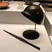 • un casque en bronze et la pointe d'une lance datant du Ier siècle av. J.-C. Le casque est constitué d'une calotte hémisphérique terminée par un bouton porte-aigrette et prolongée à la base par un couvre-nuque. La base du casque est décoré de vagues, de points, de chevrons et de traits obliques[18].