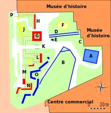 B - La corne du port, espace actuellement engazonné alors qu'au Ier siècle était rempli d'eau et prolongeait le Vieux-Port.