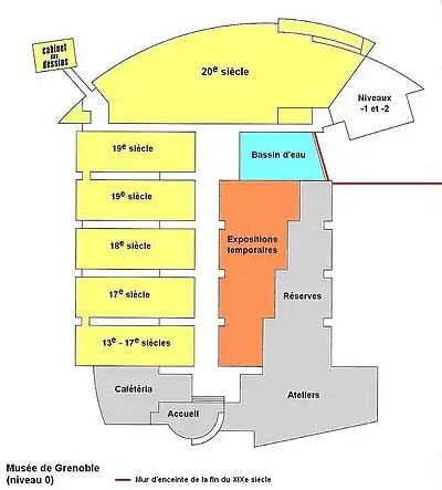 Le musée est construit sur un immense parking à trois niveaux le mettant à l'abri de tout débordement de l'Isère[notes 6]. Concernant les zones d'expositions, le musée lui-même est construit sur trois niveaux mais la plupart des salles d'exposition sont installées au niveau 0. À ce niveau, les salles sont desservies par une large galerie centrale aboutissant à un patio. À gauche, les cinq séquences d'art ancien, à droite les salles des expositions temporaires. Au fond de l'allée centrale laissée vide de toute œuvre, en arc de cercle, l'immense zone consacrée au XXe siècle et l'accès à la tour de l'Isle. Hormis les deux salles 18 et 19 des statues, l'ensemble du niveau 0 est éclairé par une lumière indirecte dont l'intensité est contrôlée par l'abaissement automatique de rideaux dans la structure complexe des plafonds, ces derniers contenant également d'une façon discrète tout le système de climatisation.