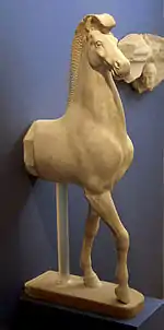 Partie antérieure de cheval, de style archaïque, trouvée en 1887 à l'est de l'Ėrechthéion. Marbre de Paros. Hauteur : 1,17 m. |