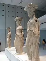 Sur les six Caryatides (ou Cariatides), quatre sont complètes ; la cinquième, au second plan à droite, est un assemblage de fragments. La deuxième à gauche, manquante, est au British Museum. |