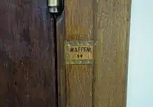 Sur le cadre de la porte d'entrée est apposé un écriteau Waffen-SS, datant de la Seconde Guerre mondiale pendant laquelle le bâtiment du musée abritait un entrepôt SS.