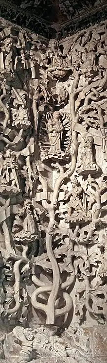 La sculpture de droite, l'Arbre des Rois, illustre l'ascendance royale de Jésus. La sculpture de gauche, souvent dénommée l'Arbre des Prophètes, présente Jésus comme l'héritier du grand prêtre Aaron, frère de Moïse, et rappelle que la venue du Christ sur terre s'est inscrite dans une longue tradition d'annonces prophétiques.