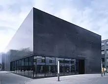 L’architecture créée pour le musée des Beaux-Arts du Liechtenstein par l’équipe Meinrad Morger et Heinrich Degelo associée à Christian Kerez est à la fois d’une grande complexité et d’une discrète simplicité. Le bâtiment est un cube noir en ciment teinté et en pierre de basalte. Les petits galets de rivière incorporés au parement extérieur confèrent à ce dernier une coloration subtile et savent aussi entrer en résonance avec le paysage de la vallée du Rhin. De plus, l’environnement se reflète sur la façade du bâtiment qui, ayant été polie à la main, fait preuve d’une séduisante beauté tactile. De longues rangées de fenêtres s’accordent au caractère compact du bâtiment et ouvrent le cube noir aussi bien vers l’intérieur que vers l’extérieur.