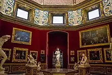 Aujourd'hui, bien que transformée au fil des siècles, c'est la seule salle où l'on puisse comprendre l'esprit originel des Offices, c'est-à-dire un lieu d'émerveillement où les œuvres des Anciens, représentées par la sculpture, et celles des Modernes, peuvent être directement comparées[19]. Certaines des sculptures antiques les plus célèbres des Médicis sont disposées autour de la précieuse table incrustée de pierres semi-précieuses (1633-1649) : Le Faune dansant (réplique romaine d'un original du IIIe siècle av. J.-C.), Les Lutteurs (copie de l'époque impériale), L'Arrotino (qui aiguisait le couteau dans le groupe de Marsyas ), Les Scythes (copie d'une statue de l'école de Pergame qui faisait partie d'un groupe avec Marsyas), L'Apollino et surtout la célèbre Vénus de Médicis, un original grec du Ier siècle av. J.-C., parmi les représentations les plus célèbres de la déesse.