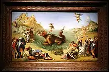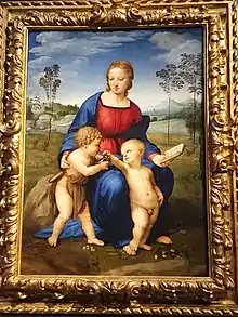 L'Adoration des mages (1481) est une œuvre inachevée, l'artiste ayant été appelé à Milan par Ludovic Sforza[16], où se manifeste le sens novateur du génie de Vinci, avec une composition très originale centrée sur la Vierge à l'Enfant dans un décor scintillant de nombreuses figures mouvantes, parmi lesquelles, le traditionnel saint Joseph ou la crèche.