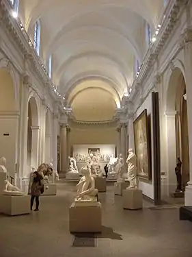 Une première salle est ouverte au public le , au premier étage de l'aile sud, dans l'ancien chauffoir de l'abbaye. Elle accueille les visiteurs le mercredi, de dix heures à treize heures[notes 1]. Plusieurs envois de l'État, en 1803, 1805 et 1811, sont déterminants pour la constitution des collections du musée des Beaux-Arts : près de 110 tableaux arrivent à Lyon[16]. On y trouve des œuvres majeures, notamment de la main du Pérugin, de Véronèse, Le Tintoret, Guerchin, Rubens, Jordaens, Champaigne et Jouvenet[17]. Dès lors, le musée de Lyon se hisse au premier rang des musées de province. La plupart de ces œuvres proviennent des saisies révolutionnaires ainsi que des pillages d'œuvres d'art de Napoléon Ier et ses armées en Italie et en Europe du Nord. Au sein du musée on aménage le musée de peintures qu'inaugure le comte d'Artois le et le cabinet des Antiques. Après la chute du Premier Empire, seuls huit des tableaux volés à l’étranger sont restitués[18].