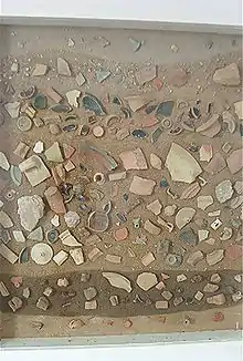 Deux dépôts de fondation contenant surtout des céramiques y furent découverts, l'un situé à la base d'un mur et l'autre dénommée « cachette » se trouvait sous le sol d'une petite pièce voûtée[4].