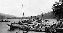 Le SMS Gäa avec des torpilleurs et des sous-marins dans la baie moyenne de Cattaro, au large de Gjenovi (Đenovići).