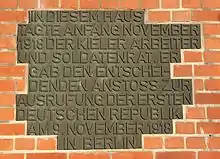 Le , la ville de Kiel a organisé la première marche commémorative des insurrections[5]. Le , la place de la gare a été rebaptisée « place des marins de Kiel » (Platz der Kieler Matrosen) en hommage aux mutineries de [6].