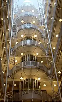 L'atrium occupe une grande place dans l'immeuble puisqu'il s'étend en hauteur du toit de la salle bancaire au sommet du bâtiment principal.