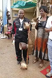 Proche de l'arc musical, l'instrument est tenu horizontalement sur la poitrine qui ferme ou ouvre le résonateur central en demi-calebasse ouverte, par un simple mouvement avant-arrière des bras, tandis que les deux mains égrènent les mélodies des deux côtés des cordes.