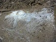 Le mycélium, appelé dans le langage courant blanc de champignon (référence à la couleur du feutrage que l'on observe par exemple dans la litière forestière)[2], est l'appareil végétatif des champignons ou de certaines bactéries filamenteuses comme les Actinomycètes (Streptomyces, Mycobacterium...). Généralement peu visible, il est composé d'un ensemble de filaments, plus ou moins ramifiés, appelés hyphes, que l'on trouve dans le sol ou le substrat nutritif. Ces hyphes sont formés de cellules très allongées et cloisonnées, à la différence de ceux dans le pseudomycélium sans cloisons vraies (structure coenocytique (en)[3] constituée de filaments formant des siphons contenant une masse cytoplasmique dans laquelle sont dispersés les noyaux)[4].