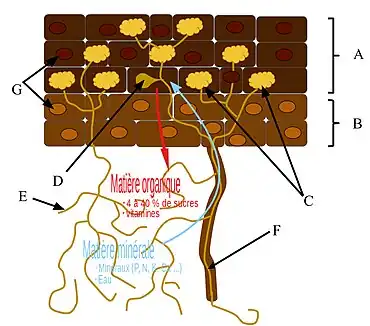 Dans cette association généralement non spécifique, les spores d'un champignon mycorhizien ou mycorhizogène (du grec myco, rhiza et génos, « engendrer », littéralement qui donne naissance à une mycorhize) sont disséminées par le vent (anémochorie), par la pluie (hydrochorie), ou par les déjections d'animaux (endozoochorie), germent, et donnent les hyphes du mycélium qui colonisent les racines d’une plante. Ces hyphes radiculaires se distinguent des hyphes extraradiculaires[2] qui se développent également à l'extérieur de la racine sur plusieurs centimètres, explorant le sol alentour du système racinaire de la plante hôte. Ce que l'on appelle couramment champignon, que l'on cueille avec son pied et chapeau, n'est que la « fructification » du mycélium, le sporophore, où se déroule la reproduction sexuée. Les hyphes se présentent comme de fins filaments, capables d'explorer un très grand volume de sol (mille mètres de filaments mycéliens pour un mètre de racine).