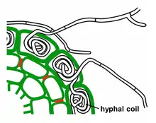 Lors de l'extension de l'apex racinaire, de nouvelles cellules épidermiques sont différenciées. L'hyphe, qui ne forme qu'un réseau autour des zones de la radicelle ayant un épiderme mature croît lors de cette extension. Il est rare qu'il se rende jusqu'à l'apex racinaire, quoique cela puisse se produire dans des conditions où la croissance de la racine est particulièrement lente[4].