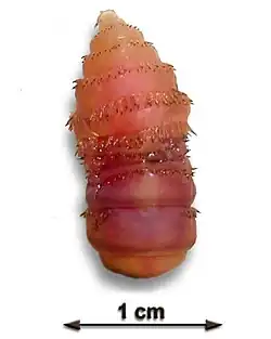 - On trouve aussi la larve de Cordylobia rodhaini, un peu plus rare et plus forestière.