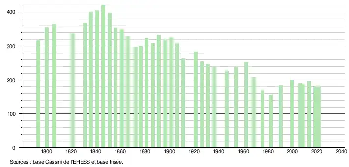 L'évolution du nombre d'habitants est connue à travers les recensements de la population effectués dans la commune depuis 1793. Pour les communes de moins de 10 000 habitants, une enquête de recensement portant sur toute la population est réalisée tous les cinq ans, les populations légales des années intermédiaires étant quant à elles estimées par interpolation ou extrapolation[17]. Pour la commune, le premier recensement exhaustif entrant dans le cadre du nouveau dispositif a été réalisé en 2008[18].