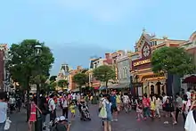 Après avoir passé Town Square, le visiteur arrive dans l'allée principale. On y retrouve la boutique Emporium dans le premier bâtiment de la rue sur la gauche tandis que sur la droite, il s'agit de Town Square Photo un magasin de pellicules et photos. Plus loin dans la rue, on trouve Midtown Jewelry (bijouterie) qui occupe l'emplacement de Main Street Cinema, Centennial Hall (une salle d'arcade) ainsi que d'autres boutiques habituelles des parcs Disney tels que Main Street Sweets (bonbons), Crystal Arts et Main Street Mercantile. À droite à la fin de la rue, se trouve le Main Street Corner Café qui possède une véranda offrant une vue sur Central Plaza et le château, tandis qu'à gauche, à la fin de la rue, un peu en retrait, se trouve le Plaza Inn qui propose de la cuisine cantonaise traditionnelle dans un décor inspiré de la Chine du XIXe siècle.