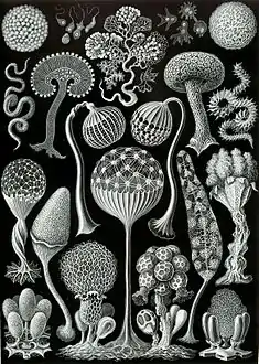 Les myxomycètes sont des eucaryotes unicellulaires qui se caractérisent par la formation d'un plasmode (vrai ou pseudoplasmode). Ils étaient initialement réunis aux champignons, car leurs cycles de vie comportent une étape de sporulation végétative macroscopique. Ce regroupement s'est avéré polyphylétique, car formé de plusieurs lignées indépendantes de protistes, aucune d'elle n'étant liée aux « champignons vrais » du règne des Fungi.