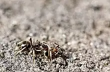 Ce phénomène a été étudié en laboratoire avec la fourmi Camponotus pennsylvanicus[6]. - La colonie peut aussi être exposée à un produit chimique écotoxique. A titre d'exemple : le fipronil est un puissant insecticide de contact ; il est utilisé contre les fourmis pour lesquelles il est extrêmement toxique, même à très faible dose, notamment pour les termites et un peu moins pour la fourmi de feu (invasive dans plusieurs régions du monde)[7]. En 2004 des chercheurs ont découvert que non seulement le fipronil tue rapidement les fourmis exposées 60 secondes à du sable traité, mais qu’il a aussi des effets indirects, à cause de la nécrophorèse ; les auteurs de l'étude ont expérimentalement déposé dans une colonie saine des fourmis mortes empoisonnées par simple contact avec du fipronil. Les fourmis qui ont transporté ces cadavres dans la fourmilière sont en grande partie mortes à leur tour (on parle de « transfert horizontal de toxicité »)[7]. Ce transfert s’est montré bien plus important et efficace pour le bifénil que pour d’autres molécules insecticides utilisées aux mêmes fins (ex : Bifenthrine et la β-cyfluthrine qui n’affectent que peu les fournis n’ayant pas eu de contact direct avec la molécule toxique)[7]. Ce comportement a été exploité par des systèmes insecticides « chevaux de Troie » dits dans ce cas « trap-treat-release »[8] (traitement basé sur une stratégie très différente de celles qui utilisent des produits répulsifs[9])