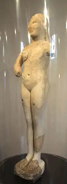 La statue, qui est conservée au musée Faina, provient de l'ile grecque de Paros. Par son style, elle est datable de la fin du VIe siècle av. J.-C.