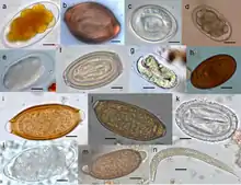 Œufs de vers parasites (surtout nématodes) dans des excréments de singes en Afrique.