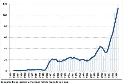 Nombre d’articles faisant référence au « néolibéralisme » dans un échantillon large de revues académiques publiées entre 1930 et 1990