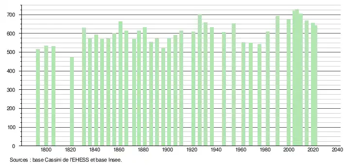 L'évolution du nombre d'habitants est connue à travers les recensements de la population effectués dans la commune depuis 1793. Pour les communes de moins de 10 000 habitants, une enquête de recensement portant sur toute la population est réalisée tous les cinq ans, les populations légales des années intermédiaires étant quant à elles estimées par interpolation ou extrapolation[26]. Pour la commune, le premier recensement exhaustif entrant dans le cadre du nouveau dispositif a été réalisé en 2004[27].