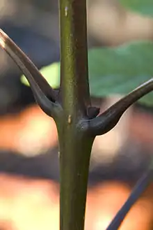 Le nœud est le point d'attache d'une feuille ou d'un rameau sur la tige chez les Spermatophytes (plantes à graines). L'entre-nœud se situe entre deux nœuds successifs. Le bourgeon axillaire, qui pousse au point d'attache d'une feuille plus âgée avec la tige, donne naissance à un rameau. À ce point d'insertion se développe ainsi une feuille ou la tige d'un nouveau rameau, ce qui se traduit parfois par un renflement plus consistant, permettant d'observer les nœuds même lorsque la feuille ou le rameau n'est pas encore développé[1].