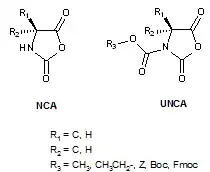Les N-carboxyanhydrides d’α-aminoacides (NCAs), connus également sous le nom d’anhydrides de Leuchs (ou 2,5-dioxo-1,3-oxazolidines) sont une classe de composés organiques préparés à partir des acides aminés naturels ou synthétiques. Du fait de leur réactivité, ils sont en particulier utilisés comme unités de base activées ou activées et protégées, pour créer des liaisons peptidiques dans la préparation de polymères à base d’acides aminés ou la préparation de peptides[1].