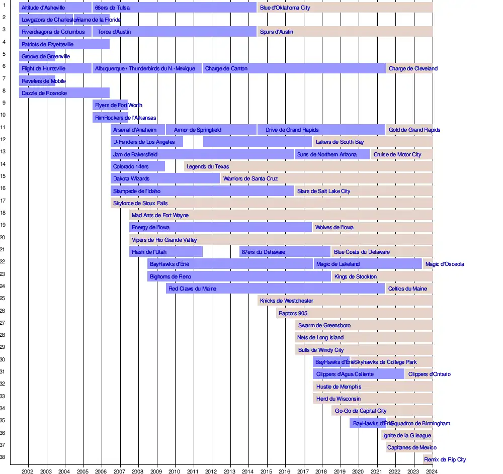La D-League comptait douze équipes pour la saison 2006-2007, quatorze pour la saison 2007-2008, seize pour la saison 2008-2009. Pour la saison 2009-2010, une 17e franchise, les Red Claws du Maine est créée[2], située à Portland, Maine. L'équipe de l'Arsenal d'Anaheim est délocalisée à Springfield[3].Le nombre est finalement de 16 franchises, puisque l'équipe des 14ers du Colorado est délocalisée à Frisco et est inactive pour la saison 2009-2010. Le , le nom de l'équipe de la franchise de Frisco est dévoilé. Il s'agit des Legends du Texas. À l'issue de la saison NBA 2013-2014, 33 % des joueurs NBA ont évolué en NBA D-League, alors qu'ils étaient 23 % en 2011.