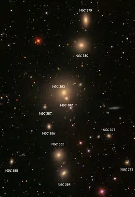 NGC 383 avec les galaxies NGC 375, NGC 379, NGC 380, NGC 382, NGC 384, NGC 385, NGC 386, NGC 387 et NGC 388 ont été inscrites dans l'atlas Arp sous la cote Arp 331. L'Atlas Arp cite Arp 331 comme un exemple d'une chaine de galaxies[3]. Puisque NGC 375 est à environ 80,2 Mpc (∼262 millions d'al) et NGC 384 à environ 58,0 Mpc (∼189 millions d'al) de nous, certaines des galaxies d'Arp 331 sont très éloignées entre elles. Les galaxies de cette chaine n'appartiennent donc pas toutes à un groupe de galaxies. Cependant NGC 383[9] et plusieurs galaxies de cette chaîne appartiennent au groupe de NGC 452, la plus grosse galaxie d'un groupe de plus d'une vingtaine de membres.