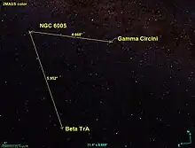 NGC 6005 est situé à environ 4,7 degrés au nord-est de l'étoile Gamma Circini et à 6,0 degrés au nord-est de Beta TrA. L'amas NGC 5999 est situé tout près au nord-ouest de NGC 6005 (voir l'article NGC 5999).