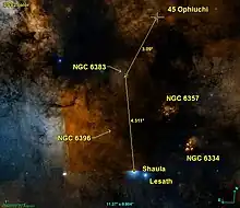 | #73 | NGC 6383 73[26] | 17h 34m 33.5359s | -32° 42′ 00.5756″ | 2,4883 ± 0,0276 | 402 ± 4 | -3,114 | -3,740 | 12,85 | Nm | |
