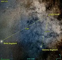 NGC 6520 est à environ 2,7 degrés au nord-ouest de Gamma Sagittarii et à environ 4,6 degrés au nord-ouest de Delta Sagittarii.