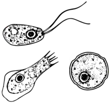 - La forme végétative ou trophozoïte : 8 à 30 µm, les flagelles n'apparaissent pas. Le corps cellulaire est déformable (pas de rigidité de la membrane) et on observe une formation abondante de pseudopodes à son pôle antérieur arrondi : la cellule est dite en « bouillonnement ».